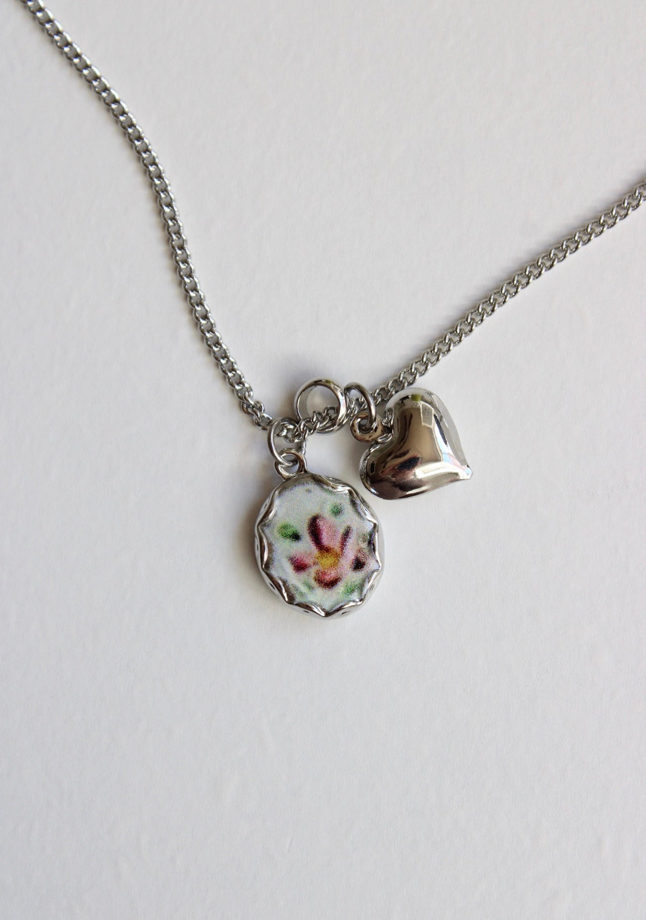 Silver Floral Cameo Necklace with Heart Charm