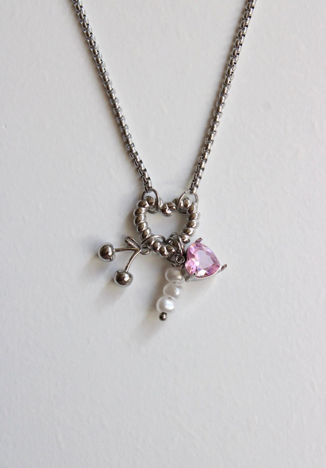 Silver Charm Necklace with Pink Heart Crystal & Pearls